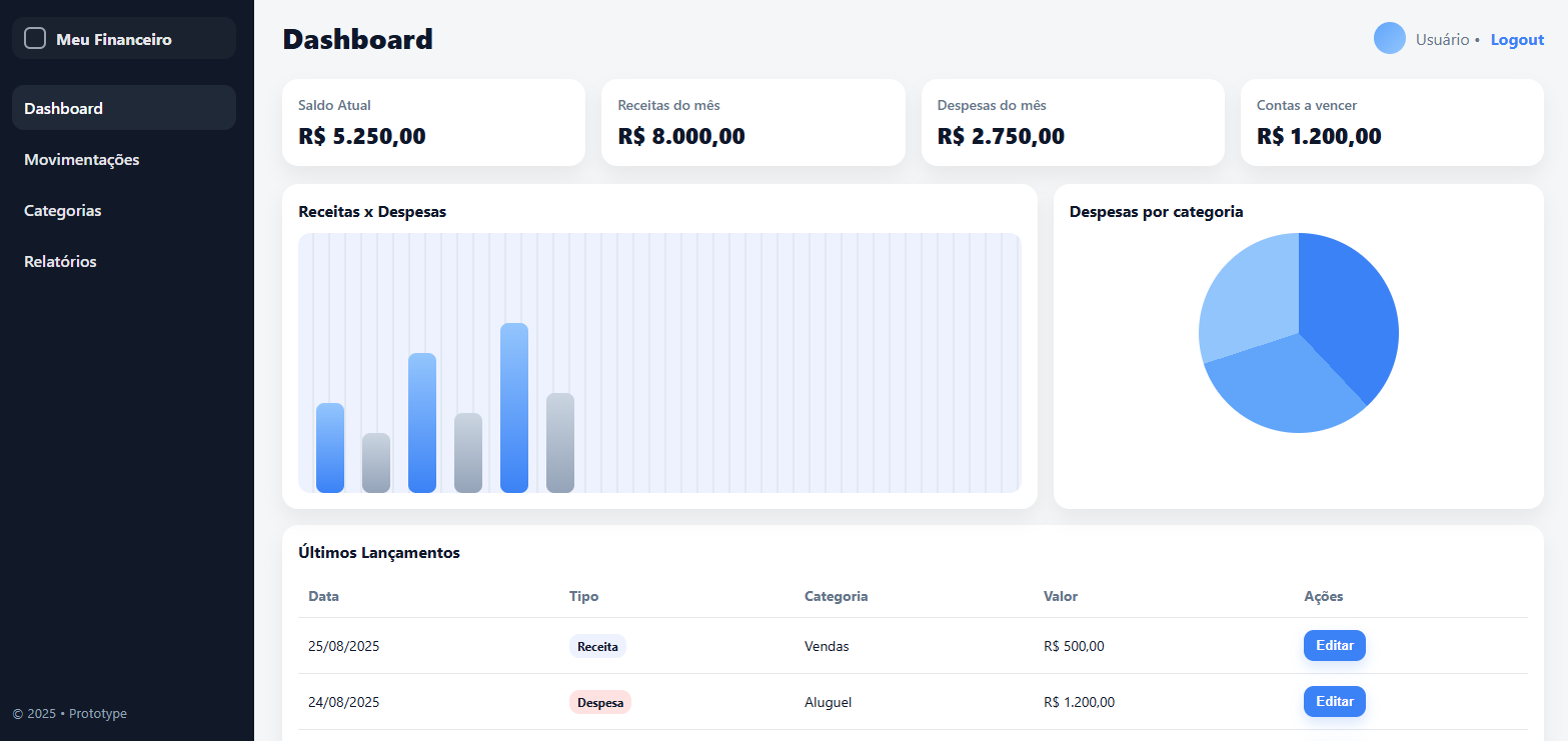 Objetivo: Cadastrar e gerenciar receitas e despesas.